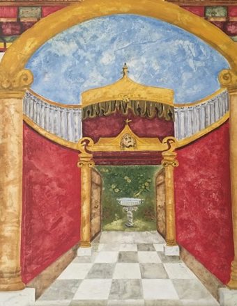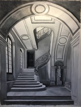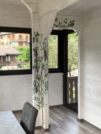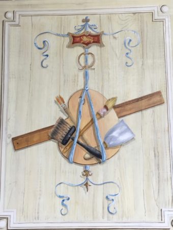 - Peintures murales en trompe l’œil réaliste, fresques, panoramiques, frises, grisailles, ornements, décors de plafonds, ciels peints, décoration de portes…
